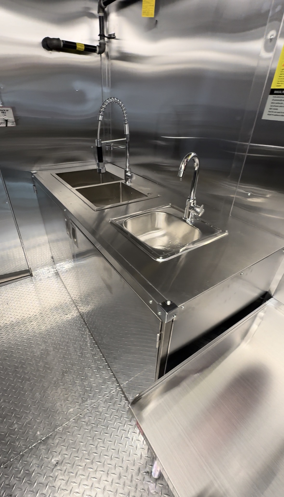 Stainless Steel Sink Stainless steel cabinet doors Portable fresh water capacity 25gal wastewater capacity 6-gallon hot water heater Water pump Double ware wash sinks Hot & cold mixing faucet Handwash sink Counters |